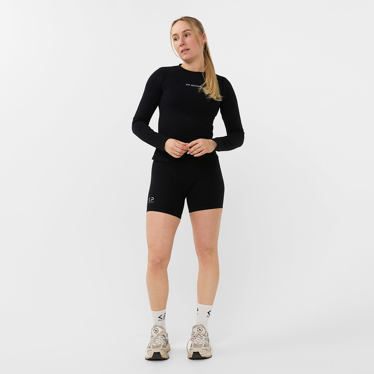 Designed to enhance your natural shape, the V-Shape Shorts in Black feature a flattering V-shaped waistband that contours your waist and highlights your curves in all the right places. The shorts have a smooth, sculpting fit without a butt scrunch for a clean and minimal look. Finished with a reflective KP Active logo for added visibility during outdoor or evening workouts.