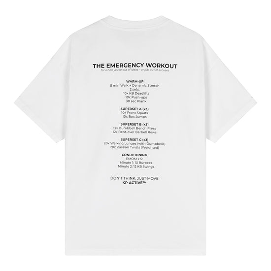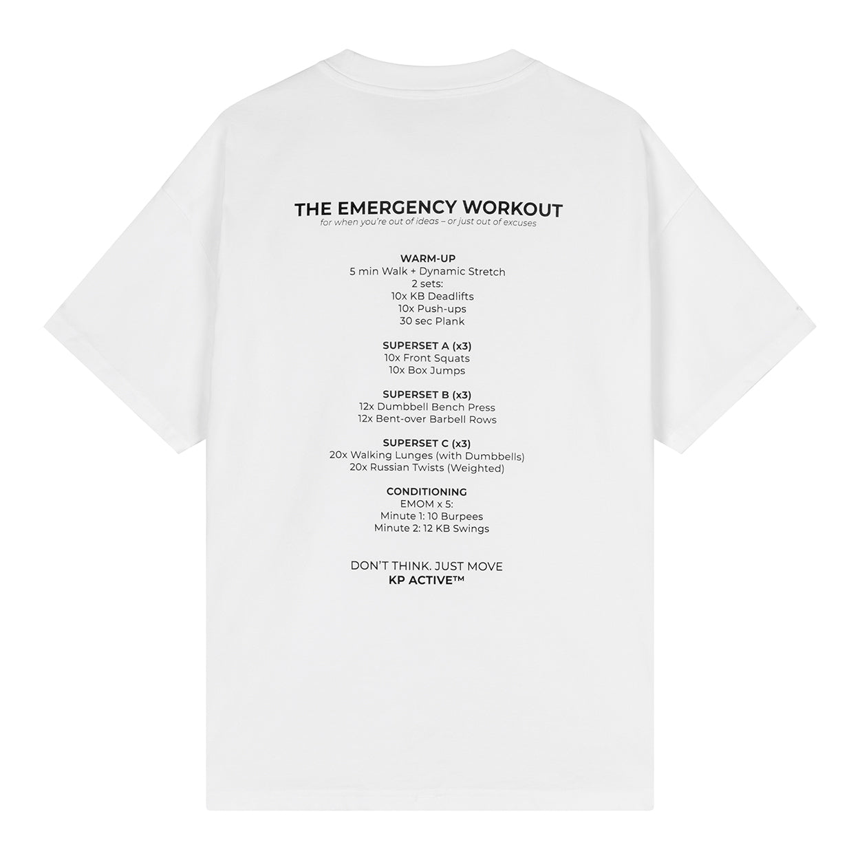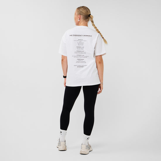 OVERSIZED EMERGENCY WORKOUT T-SHIRT – WHITE WITH GREY PRINT
